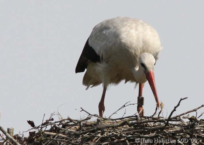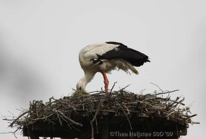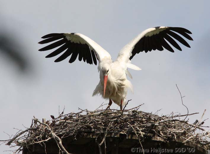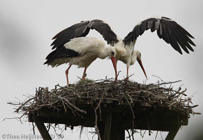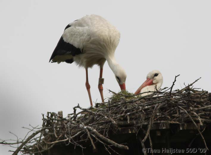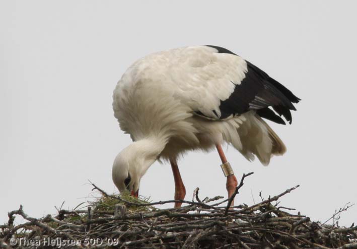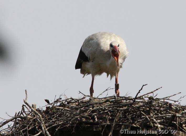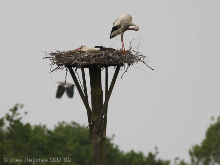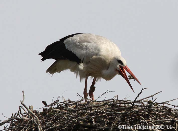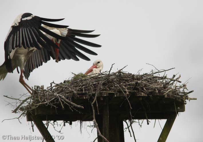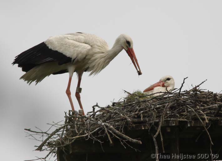 Het mannetje heeft voedsel gezocht en brengt dit naar het nest.